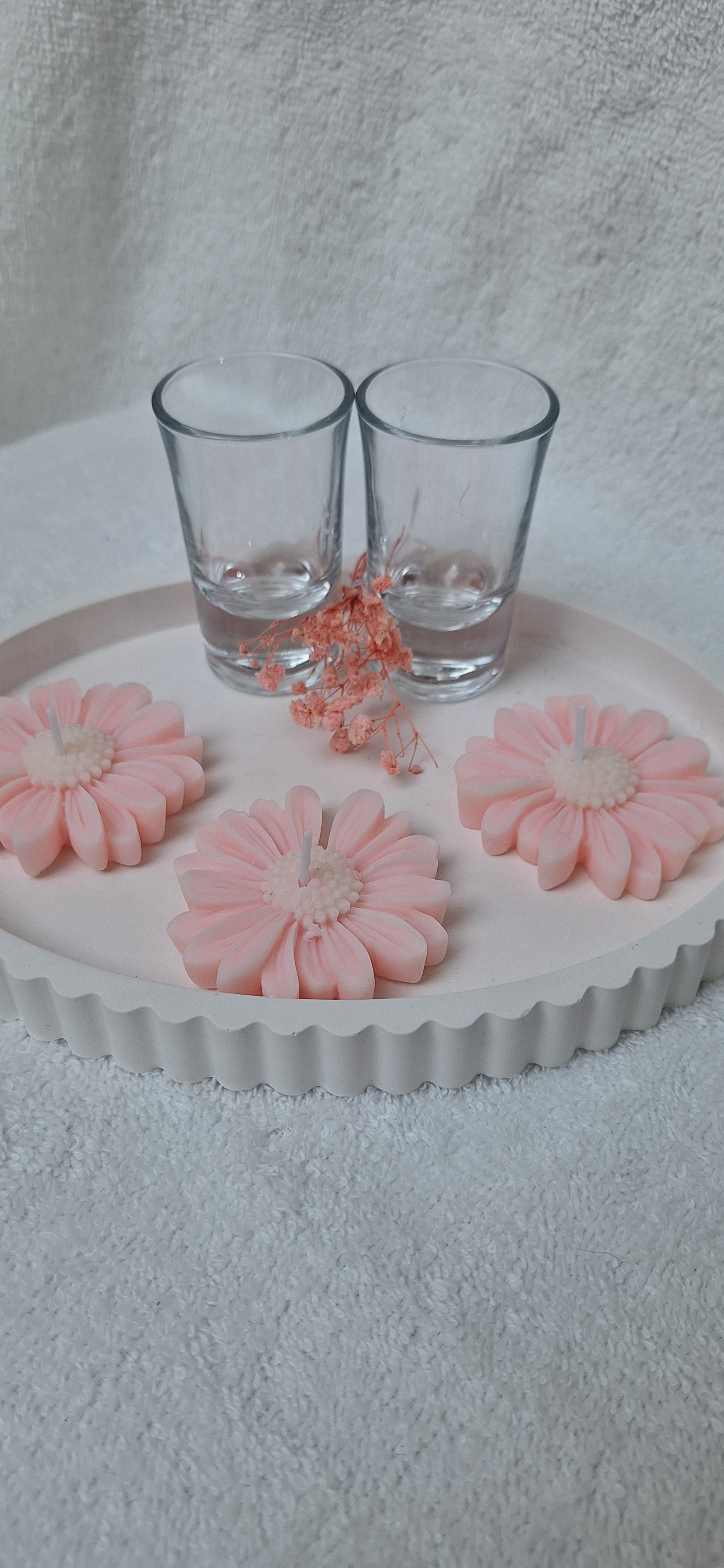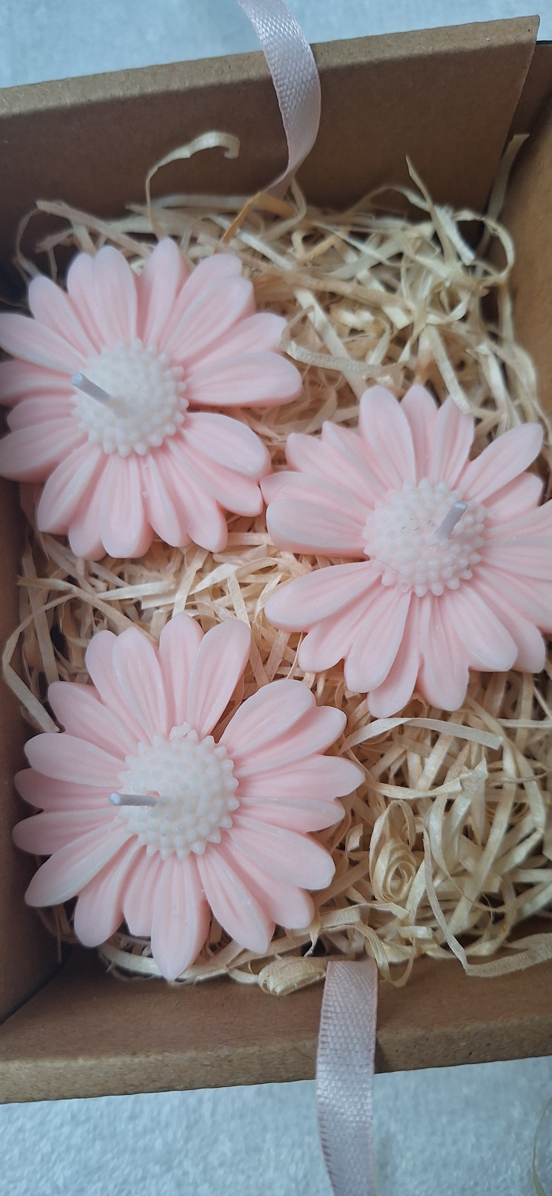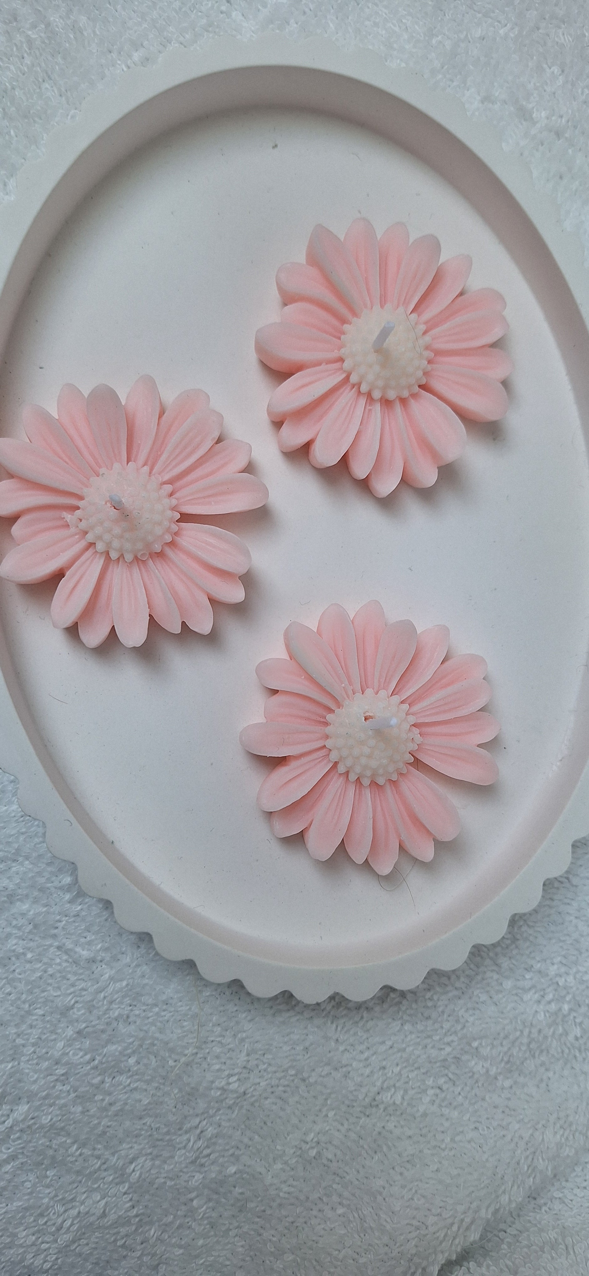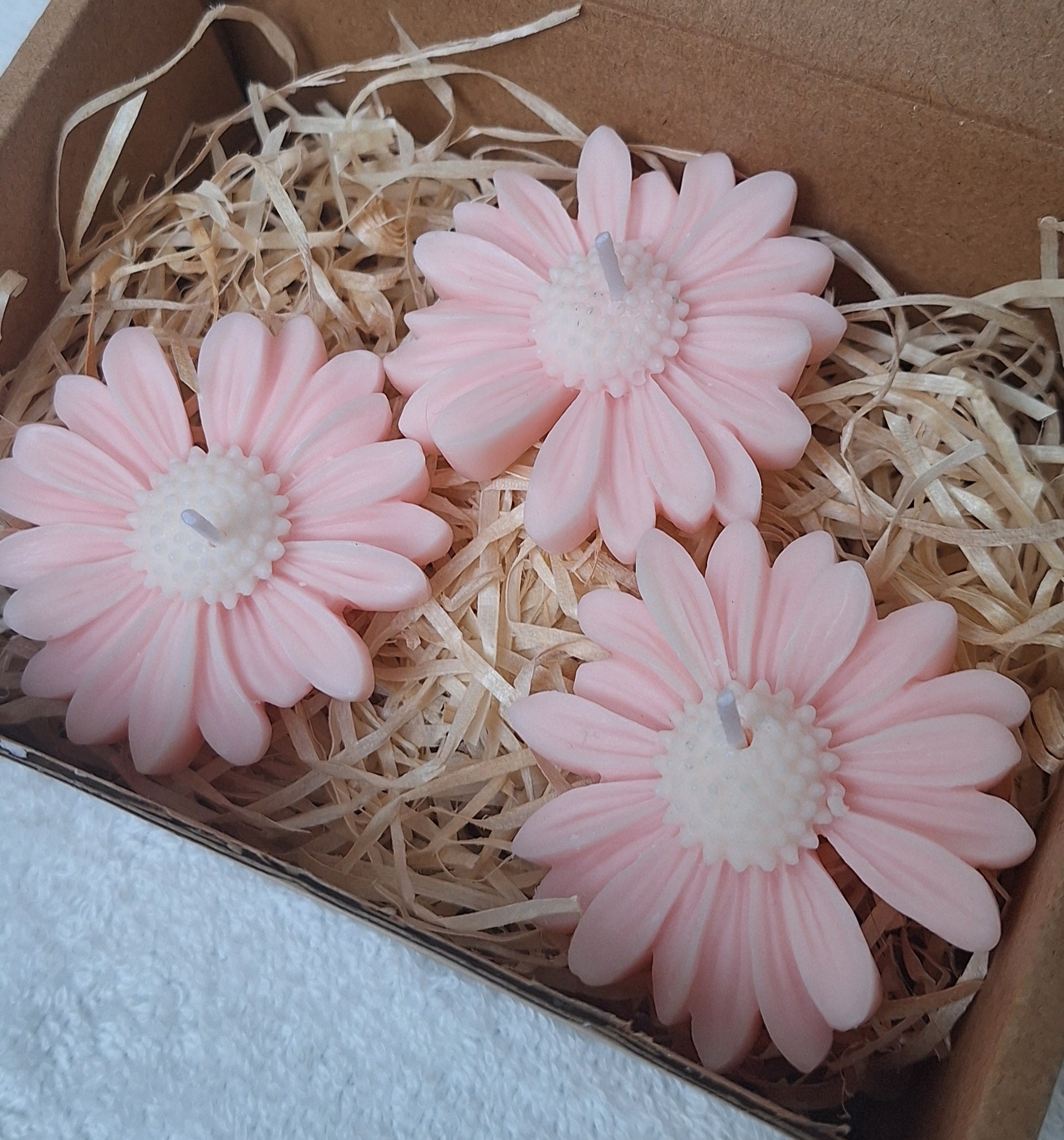 Drei handgefertigte Margeritenblüten in zartem Rosé, jede mit 6 cm Durchmesser und 1 cm Höhe. Zusammen wiegen sie 60 g – ein filigranes Arrangement voller Liebe zum Detail. Ideal als bezauberndes Geschenk oder als elegante Dekoration für besondere Momente.
