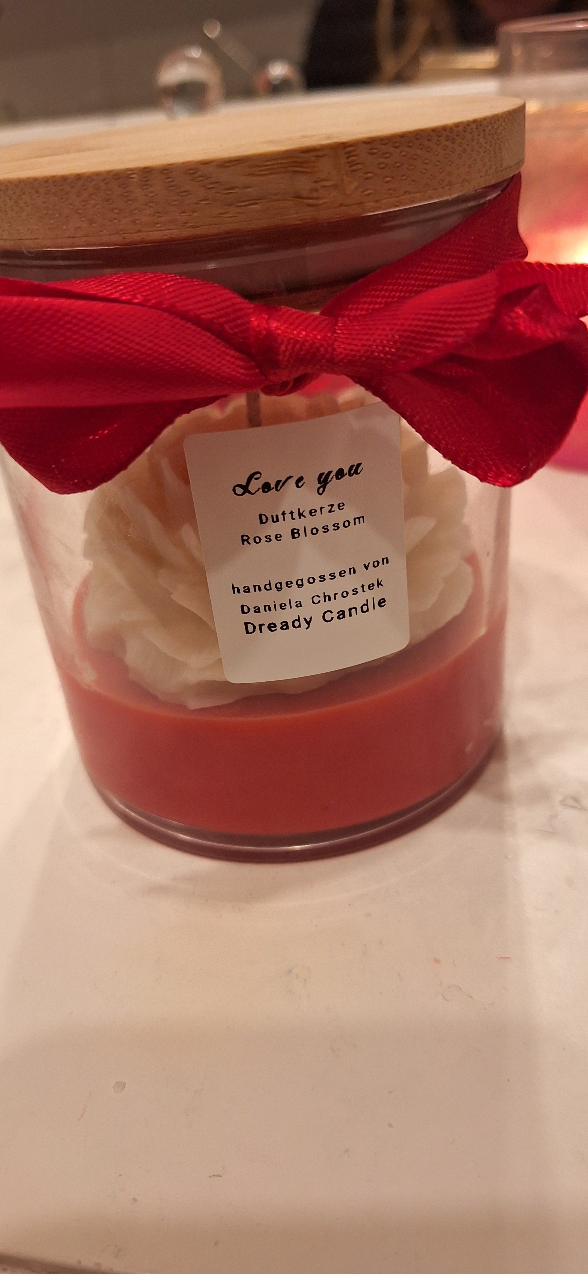 Der untere Teil der Kerze besteht aus tiefrotem Wachs, das die leidenschaftliche Farbe der Liebe symbolisiert. Auf der Oberfläche thront eine filigrane, weiße Rose – ein kunstvolles Detail, das die Kerze zu einem echten Blickfang macht. Das Glas ist außen mit einem dekorativen roten Schleifenband verziert, was die Kerze zu einem perfekten Geschenk oder stilvollen Dekorationsstück macht.