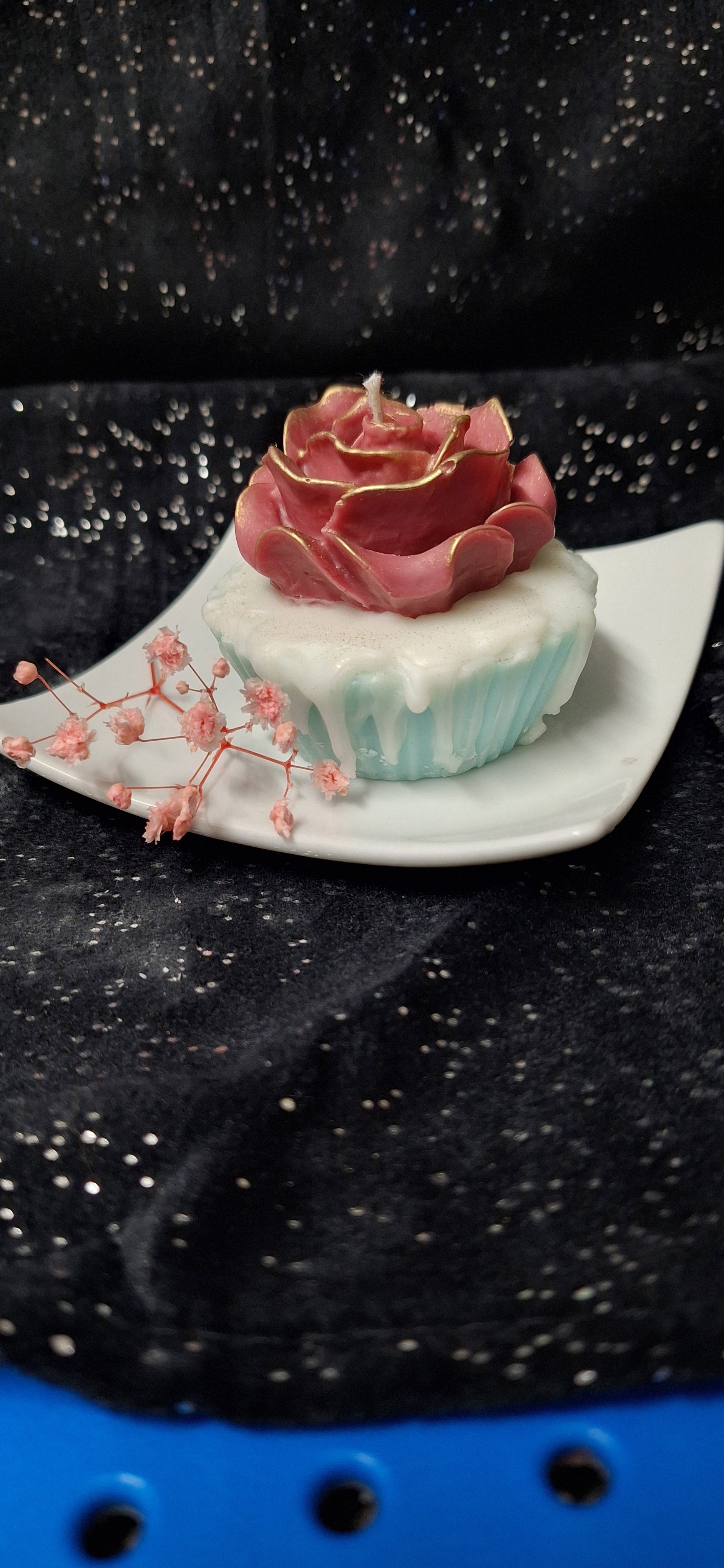 „Handgefertigte Kerze in Muffin-Form mit liebevoll gestalteter Rosenverzierung in edlen Farben. Der zart überzogene Topping-Effekt Zuckerguss verleiht der Kerze einen besonders eleganten Look.
