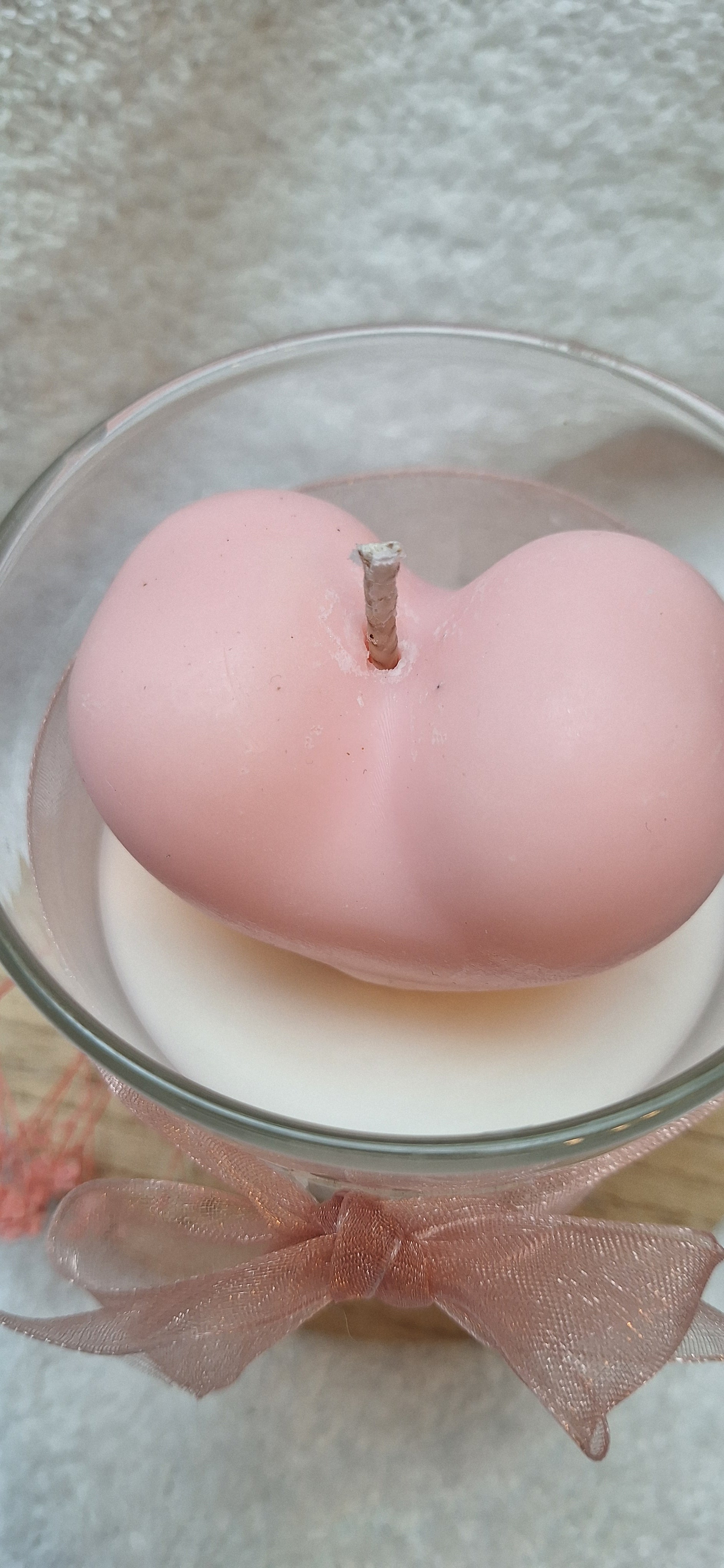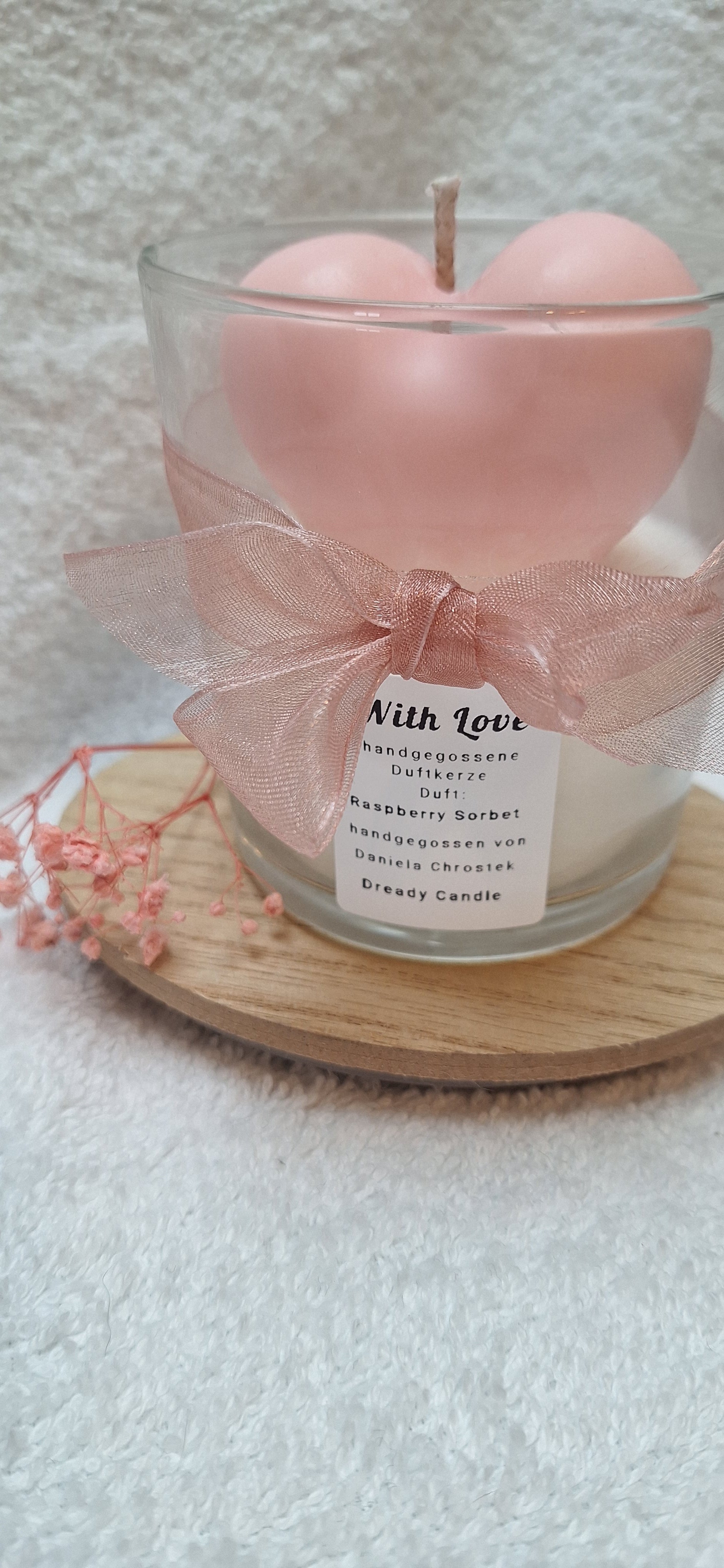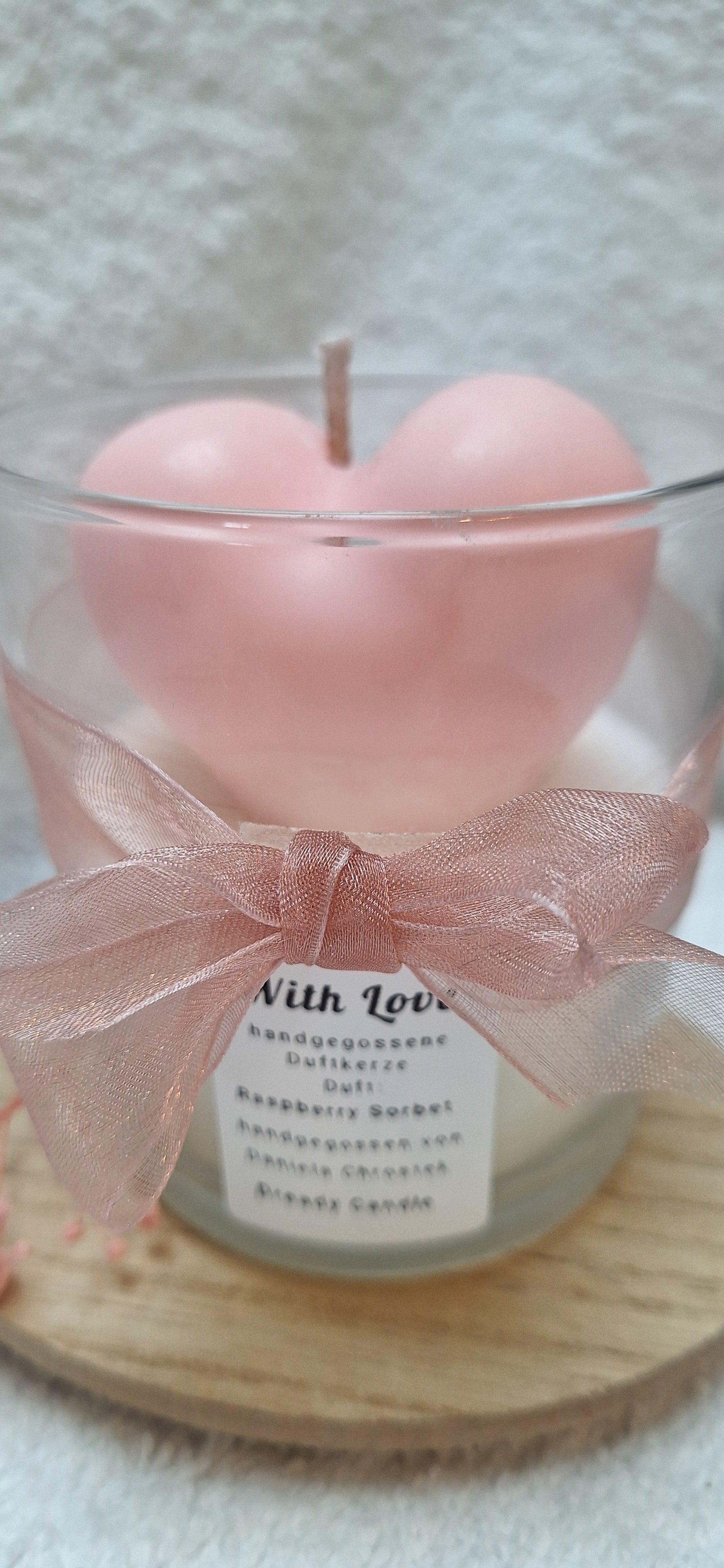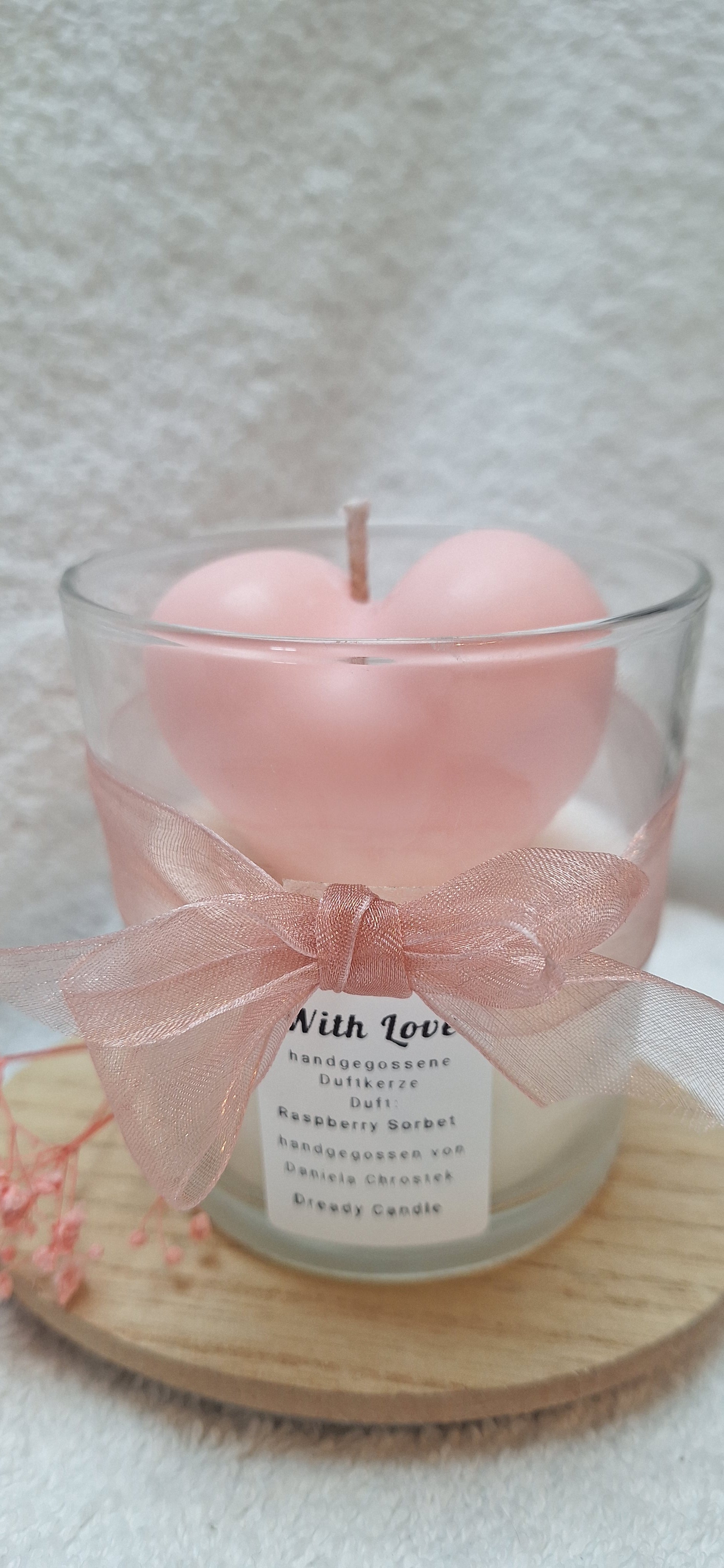 With Love ist eine liebevoll handgegossene Kerze, eingebettet in ein Glas und gekrönt von einem zartrosanen Herz.